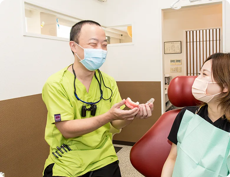 虫歯や歯周病など、お口の悩み全般に対応します。特に子どもの診療で怖いという印象を与えないように工夫もしており、一人ひとりに配慮を払いつつお口の健康を守ります。