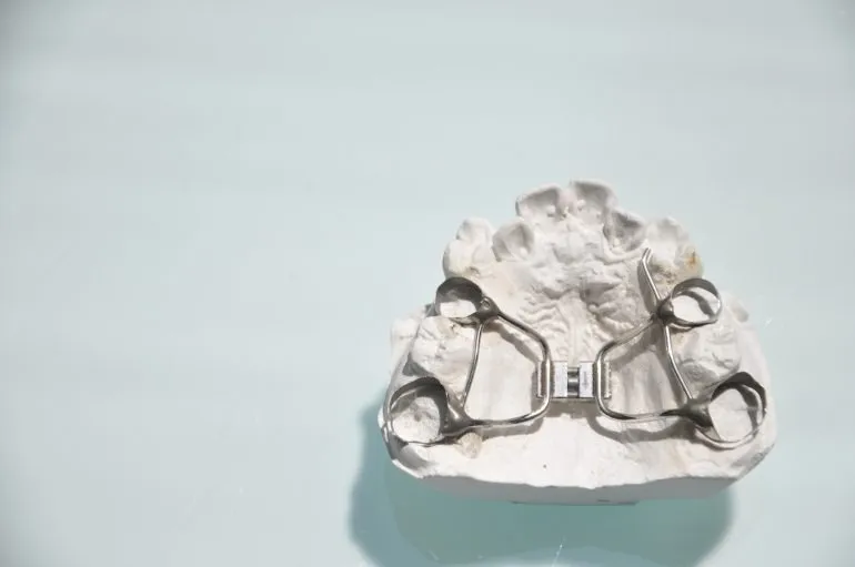 リンガルアーチは、歯の裏側にそったアーチにスプリングを接合し、スプリングの弾力を利用して歯を目的の方向へ動かします。拡大後の後戻り防止としても使用されることがあります。