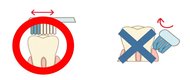 - 歯肉が落ち着くまでは、傷口の歯磨きは控えてください。術後しばらくは下の図のように歯に歯磨きをお願いします。