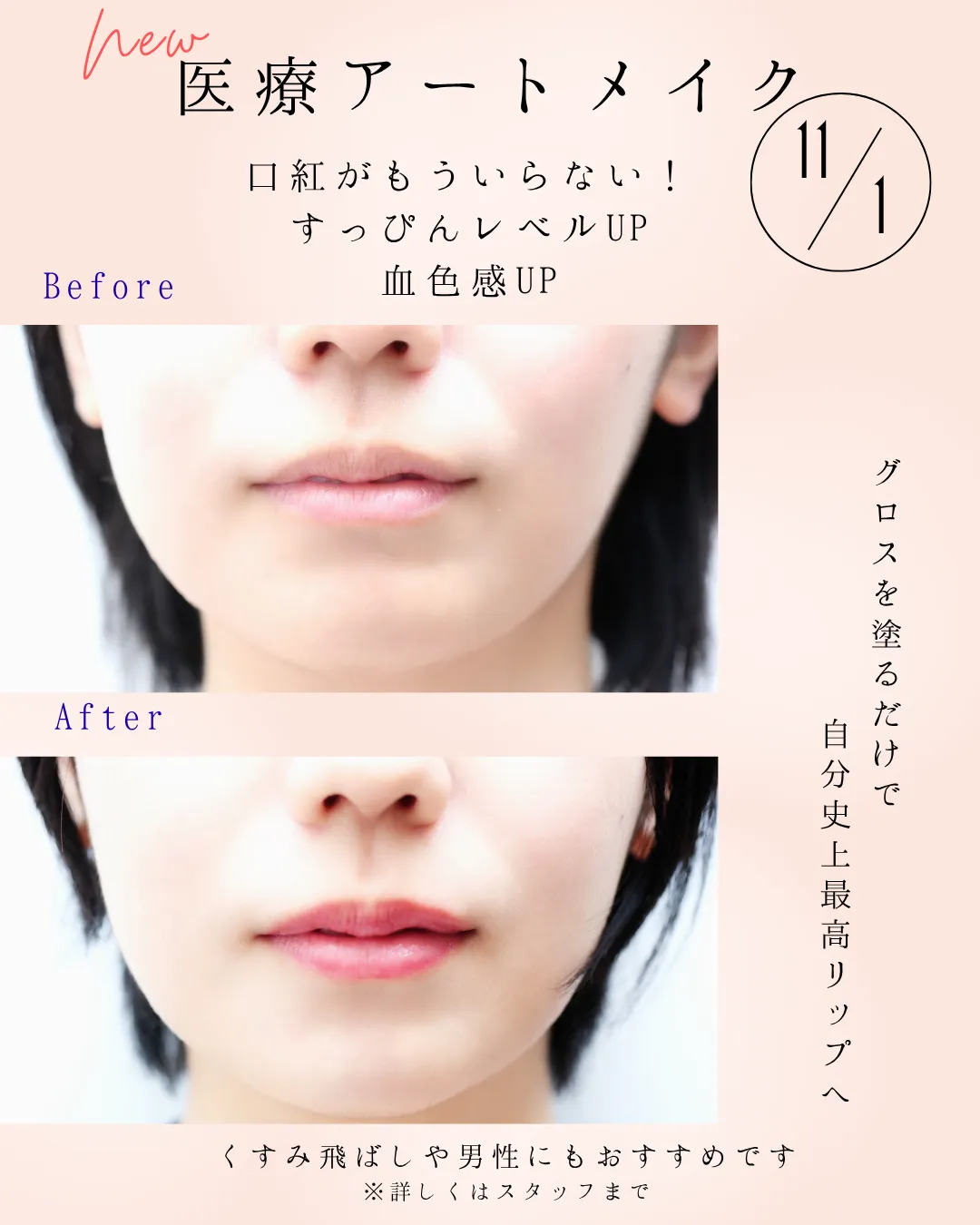 左右差、色ムラ、くすみなど様々なお悩みに対して、少しでもリップラインや色が綺麗に見えるようアドバイスをさせていただき、