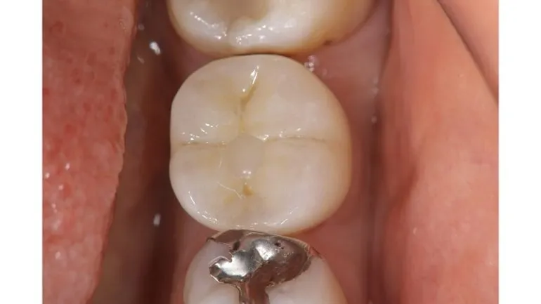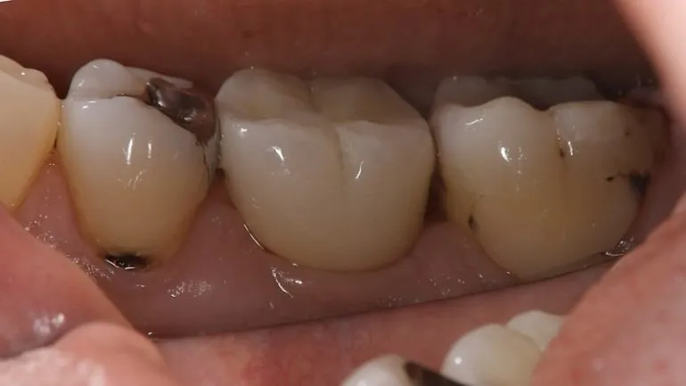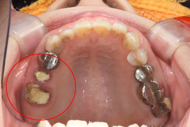 治療説明 | 一番奥の歯が折れて抜歯が必要になったため、抜歯と同時に骨造成とインプラント埋入手術を行いました。その日に仮歯を装着し、3ヶ月後に最終的な型取りを行いました。痛みや腫れはほとんどなく、治療中も比較的自由に食事をしていただけました。 |